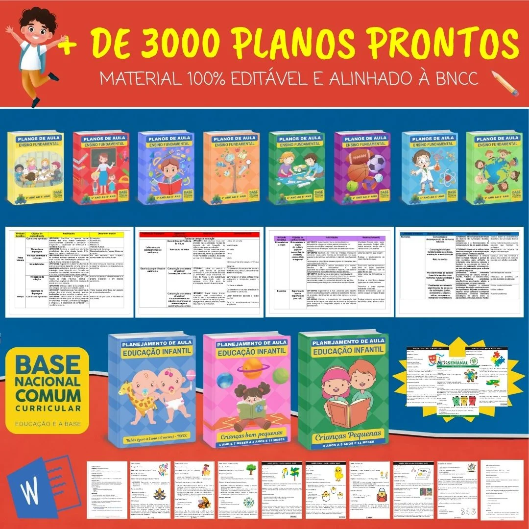 Adquirindo nosso material você irá receber Planos de Aulas prontos para Educação Infantil e Ensino Fundamental de todas as disciplinas.