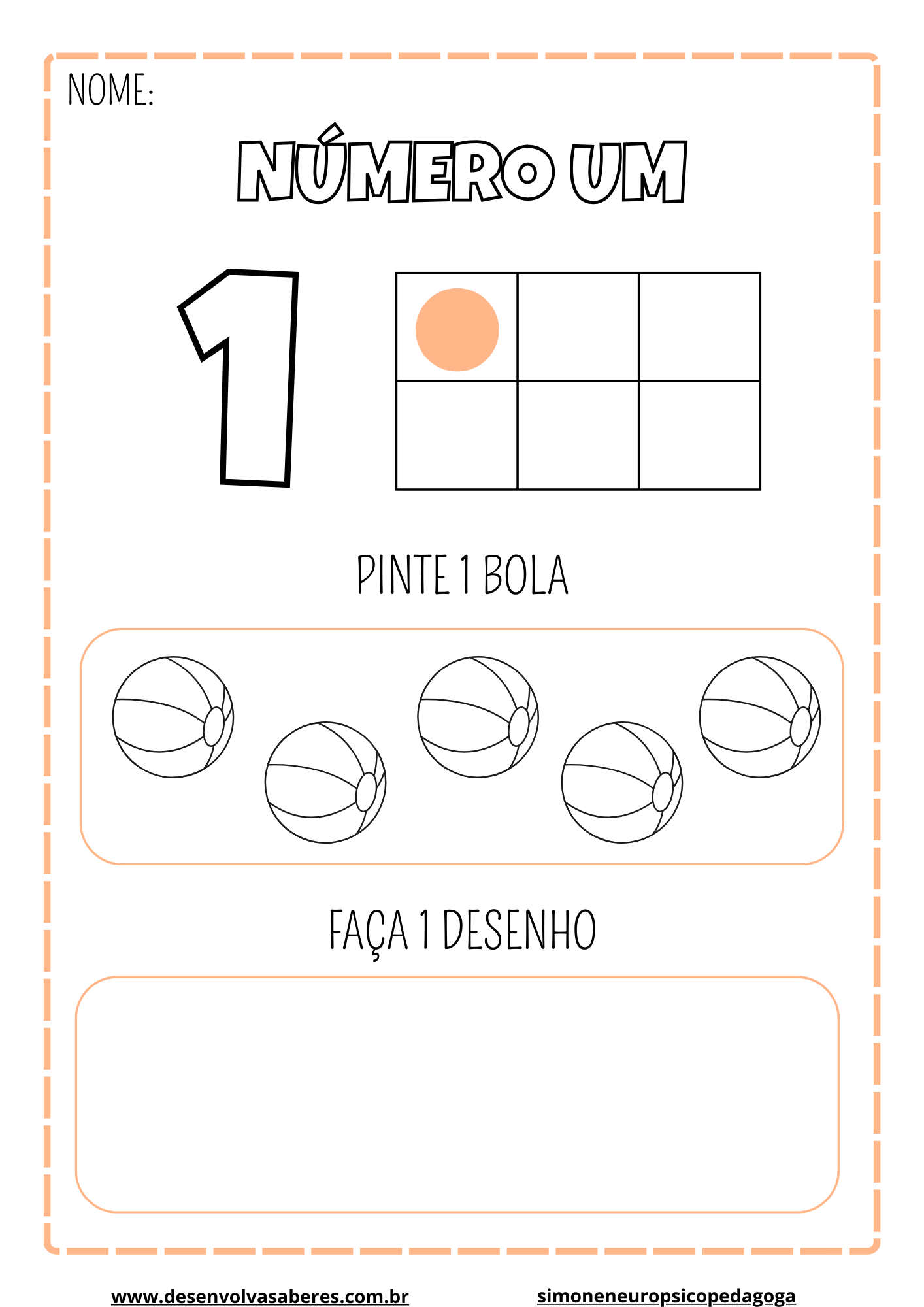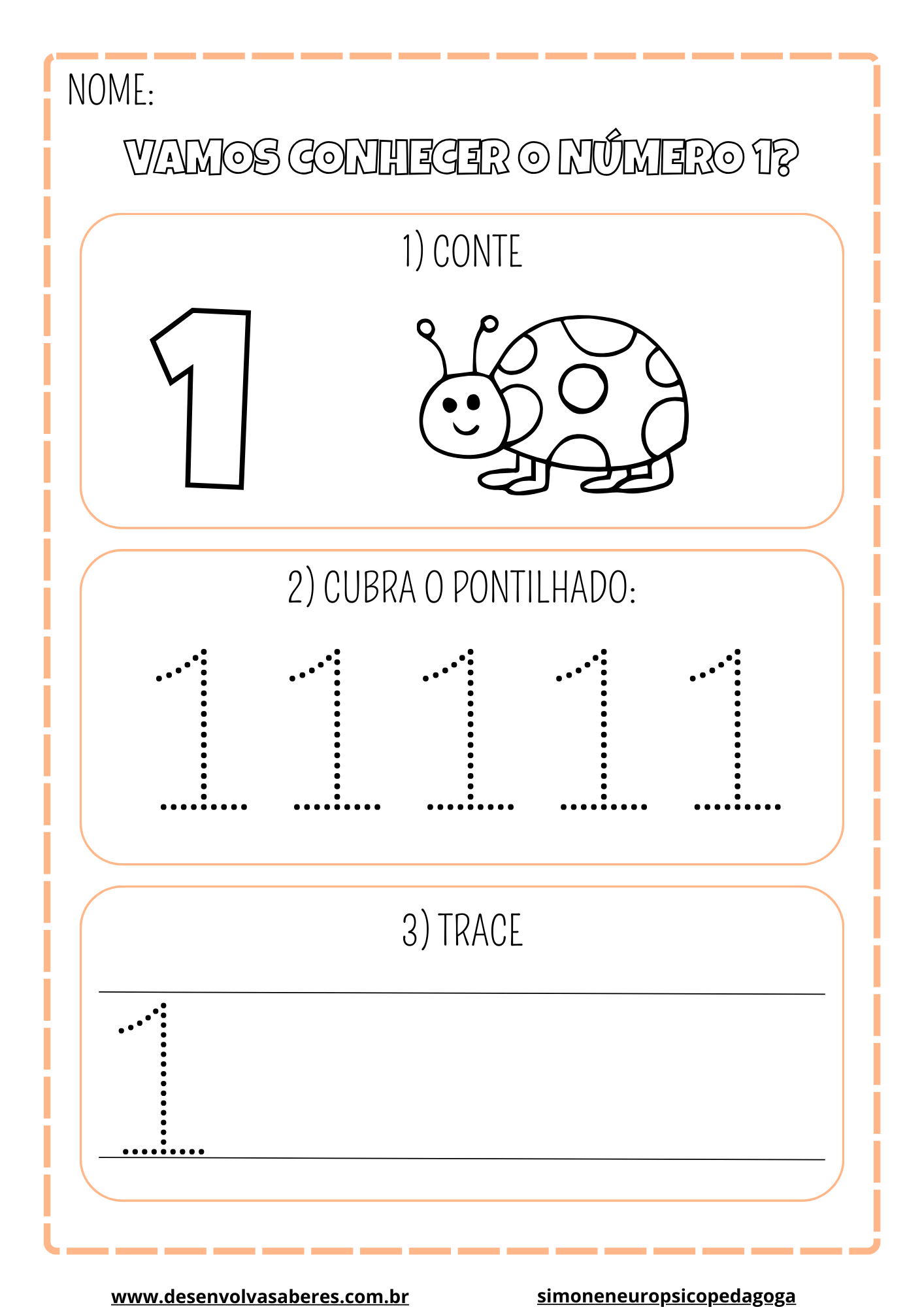 Os conteúdos abordados são: Traçado dos numerais, Contagem de 1 a 20, Pintura, Desenho, Relação número/quantidade